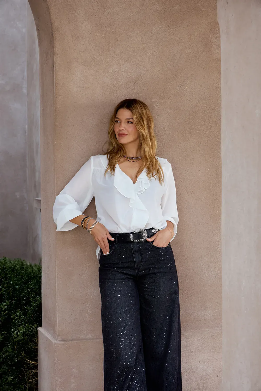 La Blusa Mayurak presenta un diseño con manga larga y elástico en los puños. Escote en V con terminación en volado