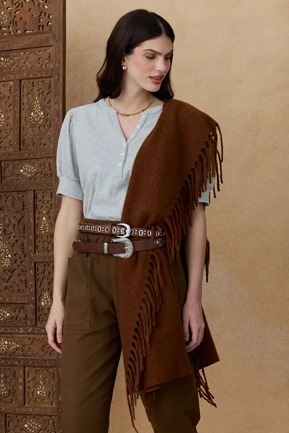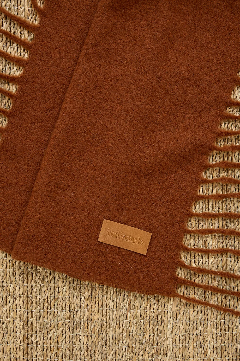 La Bufanda Jouri es un accesorio confeccionado en tejido suave con detalles de flecos en los extremos.