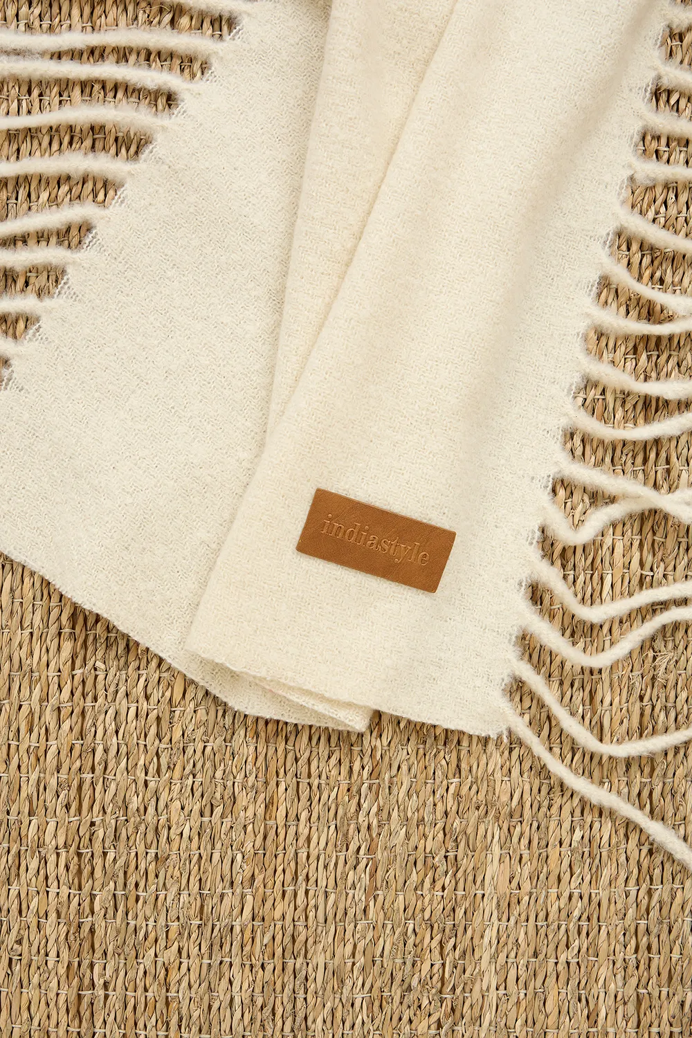 La Bufanda Jouri es un accesorio confeccionado en tejido suave con detalles de flecos en los extremos.