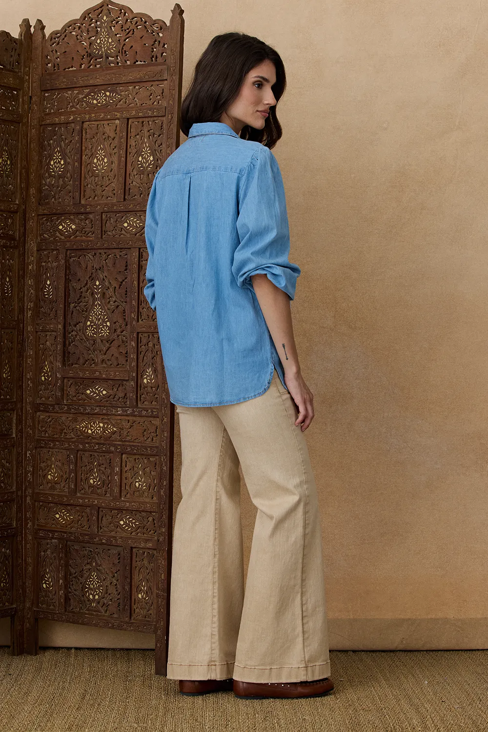 Camisa Dapiche de denim de algodón suave con mangas largas estilo balloon. Lleva bordado delicado en el canesú central que aporta detalle artesanal.Combina ideal con Jean Adele y Bota Luna.