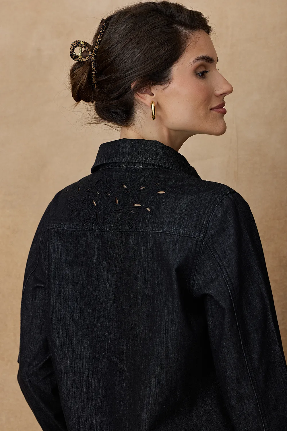 Camisa Tila confeccionada en suave denim de algodón, con mangas largas y puños. Presenta cierre frontal con broches y bolsillos delanteros con detalles bordados y calados, que también se repiten en la espalda alta. Una prenda versátil para looks urbanos con textura y diseño. Ideal para combinar con Jean Mutizia y ballerinas Gia.