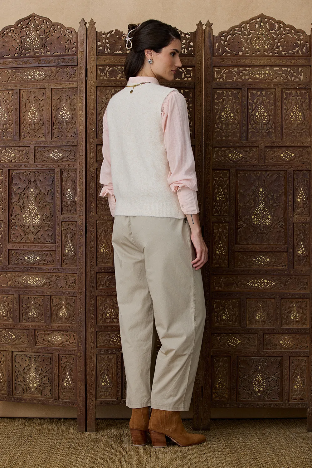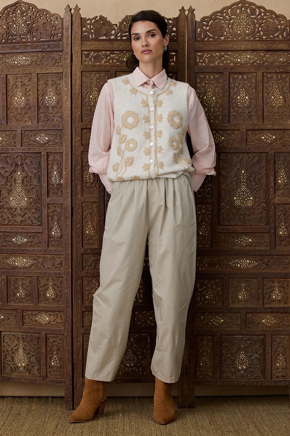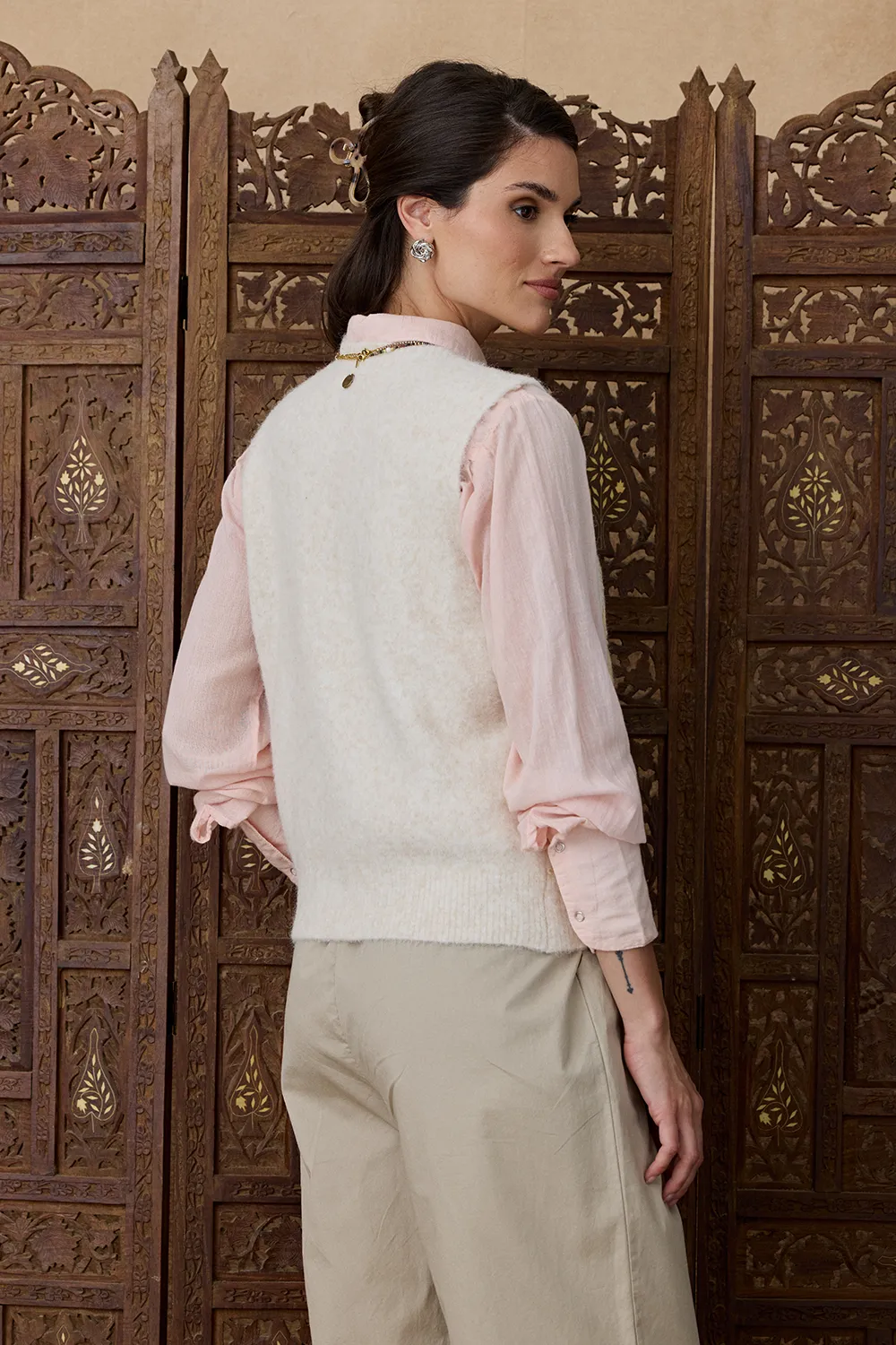 Chaleco tejido con botonadura frontal y detalles bordados.