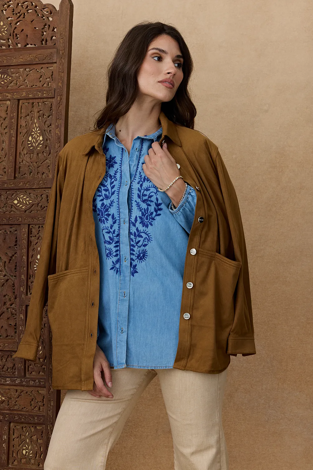 Chaqueta Carape de tacto suave y calce holgado. Diseño con botones frontales, cuello camisero y grandes bolsillos delanteros. Una capa liviana y funcional para superponer en media estación. Ideal con Jean Electra y Camisa Gulluk.