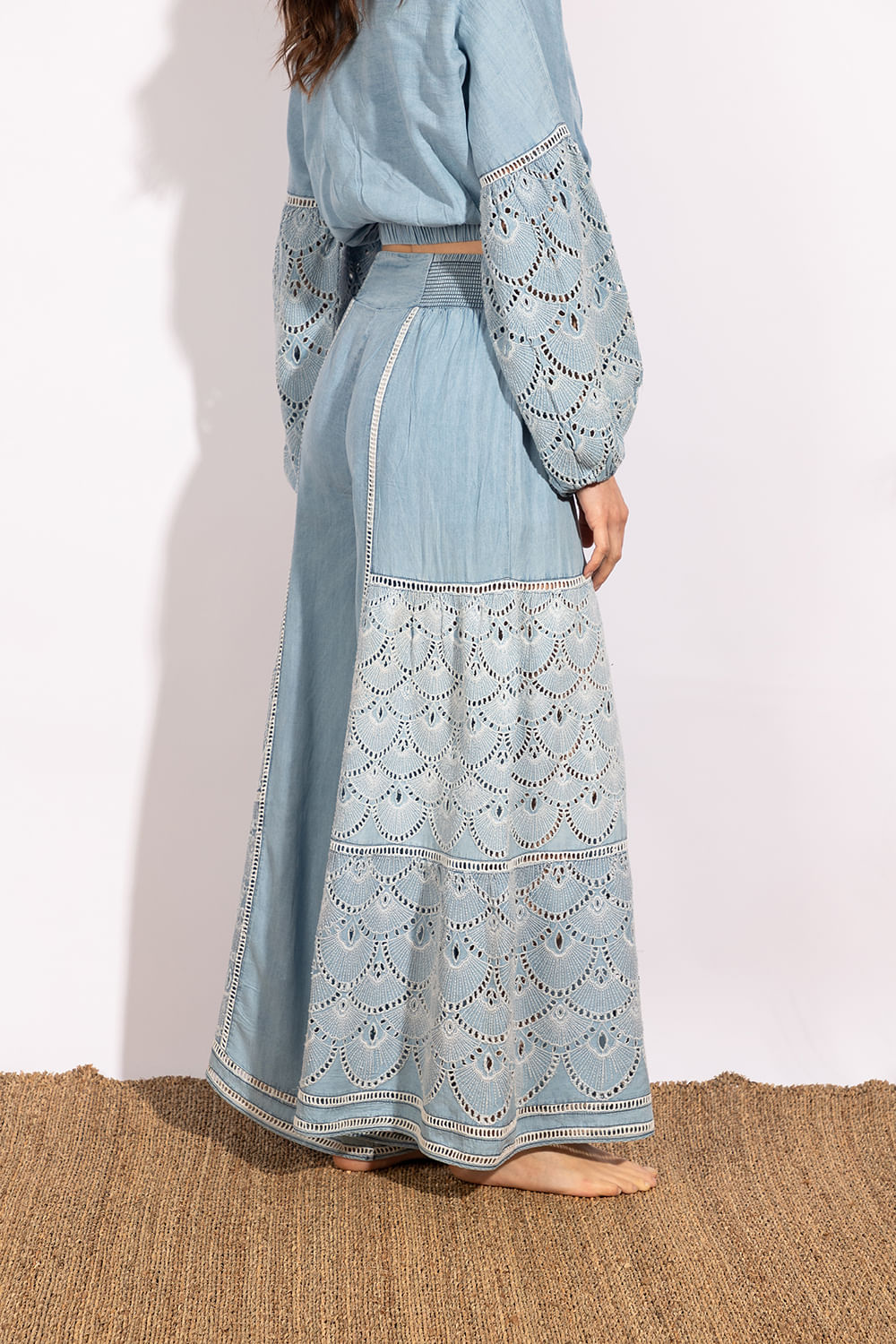 Pantalón con exclusivo diseño de calados con un estilo amplio y holgado. Cuenta con cintura elástica para ajustarse al cuerpo y un gran festón bordado que crea un hermoso lazo en la parte delantera. Confeccionada con lino 100 % algodón, lo que les da un toque fresco y distinguido.