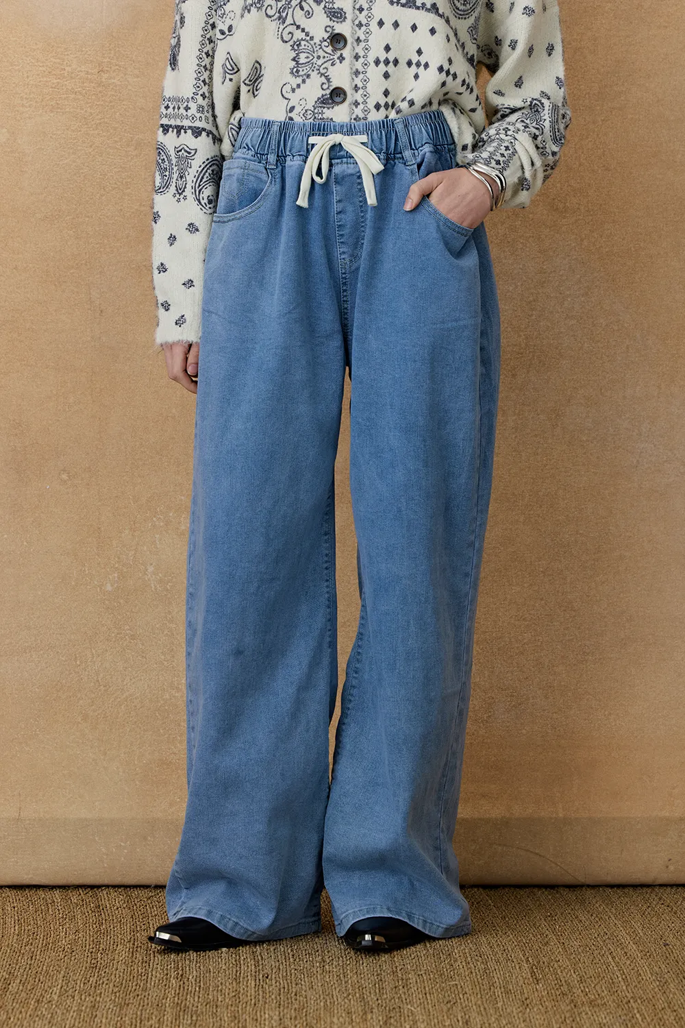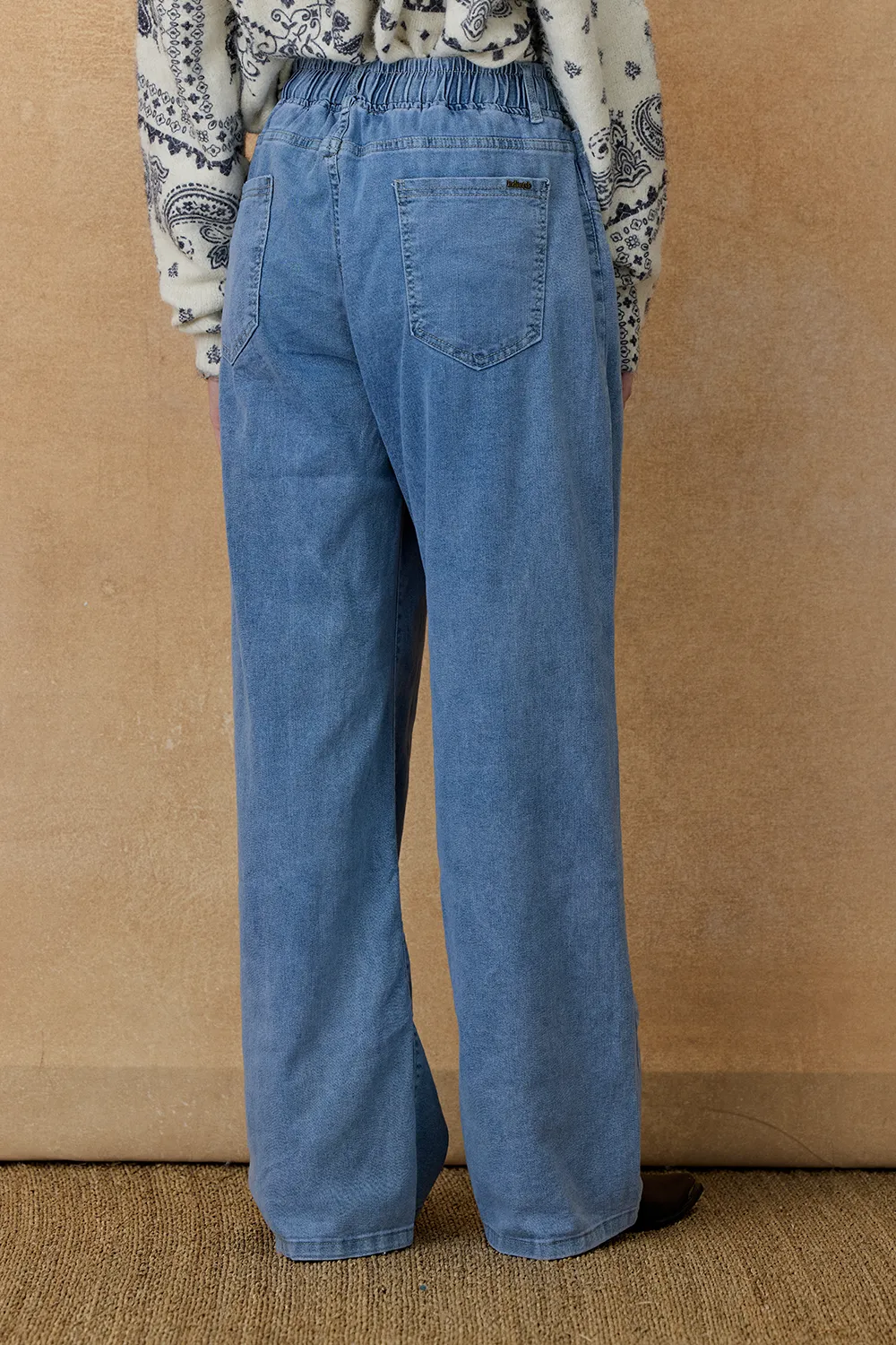 Pantalón Olivo en denim de algodón suave, de calce holgado y cintura con elástico para mayor comodidad. Con bolsillos delanteros y traseros. Combina con Camisa Alacati o Remera Jupulo.