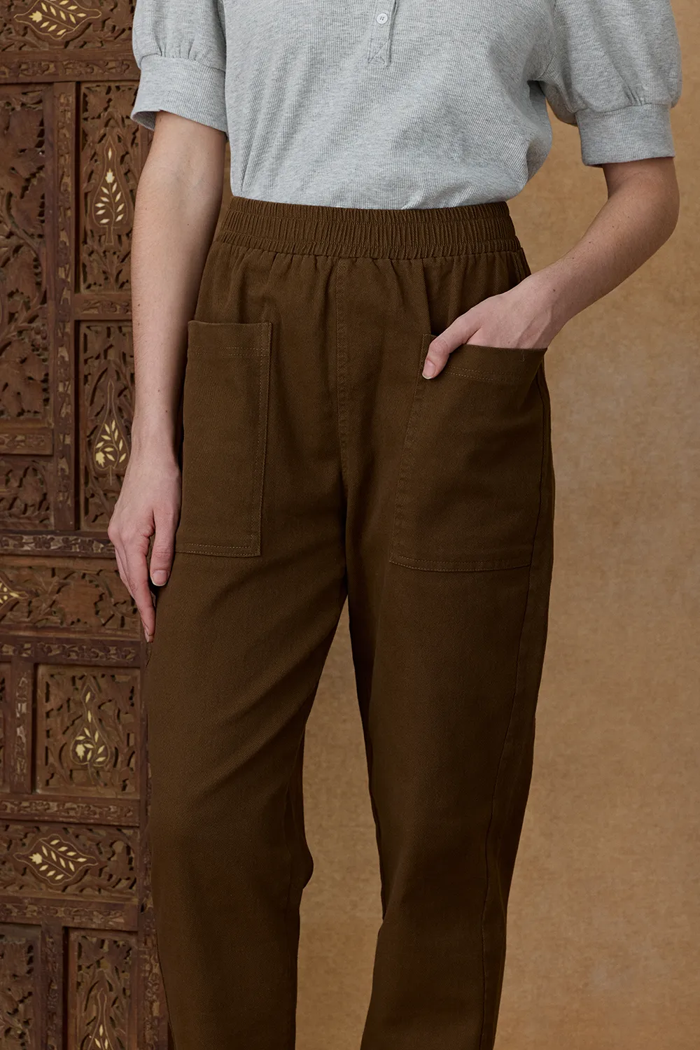 El Pantalón Venecia presenta un diseño de corte cigarette con cintura elastizada