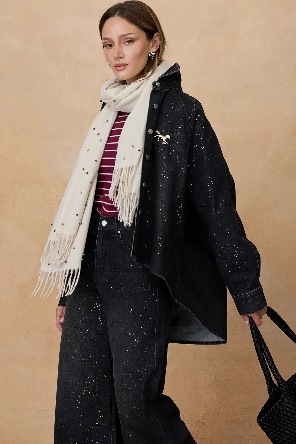 La Pashmina Mirra presenta apliques de perlas.
