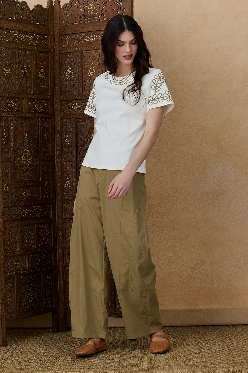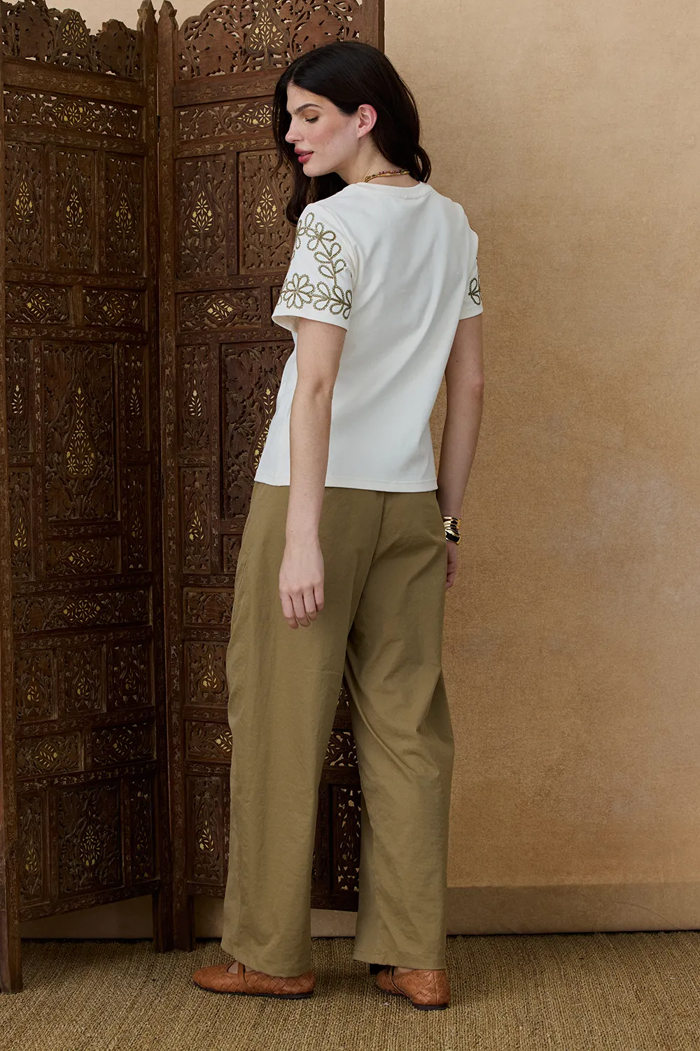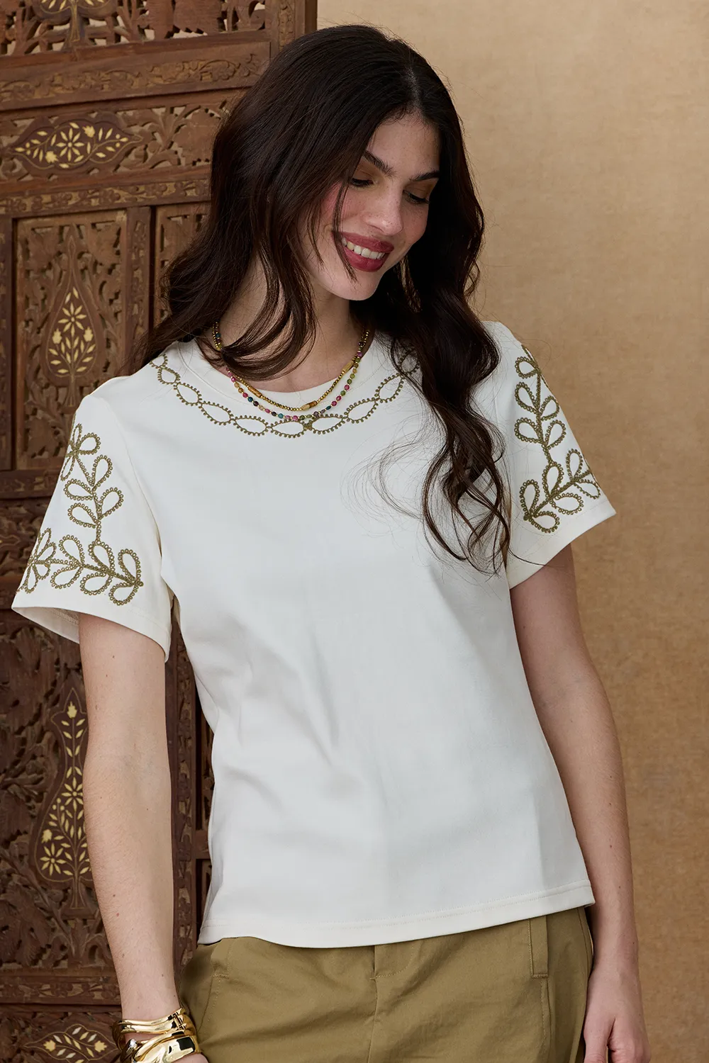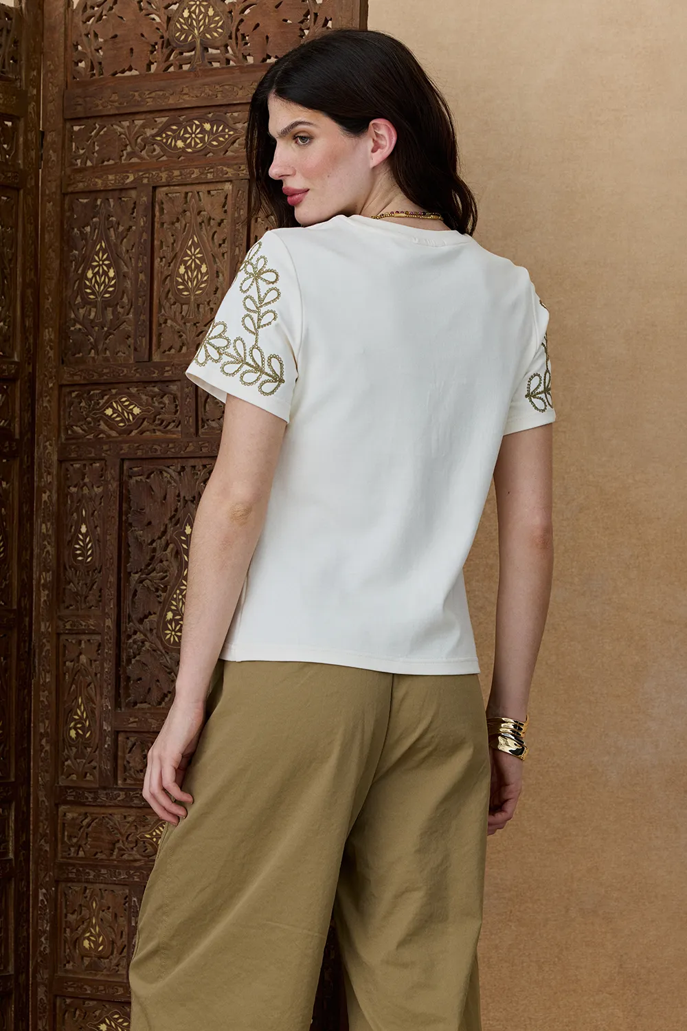 La Remera Kaimur está confeccionada en algodón elastizado. Presenta delicados bordados a contratono alrededor del cuello y las mangas.
