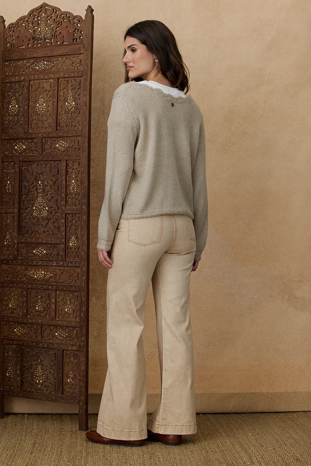 El Saco Chitrak presenta un diseño tejido con detalles calados en su parte frontal y escote