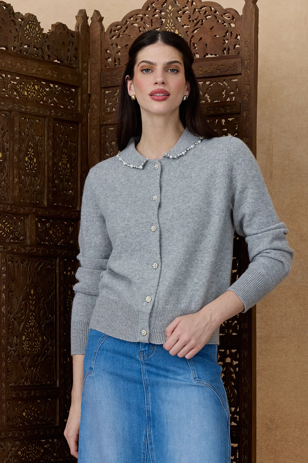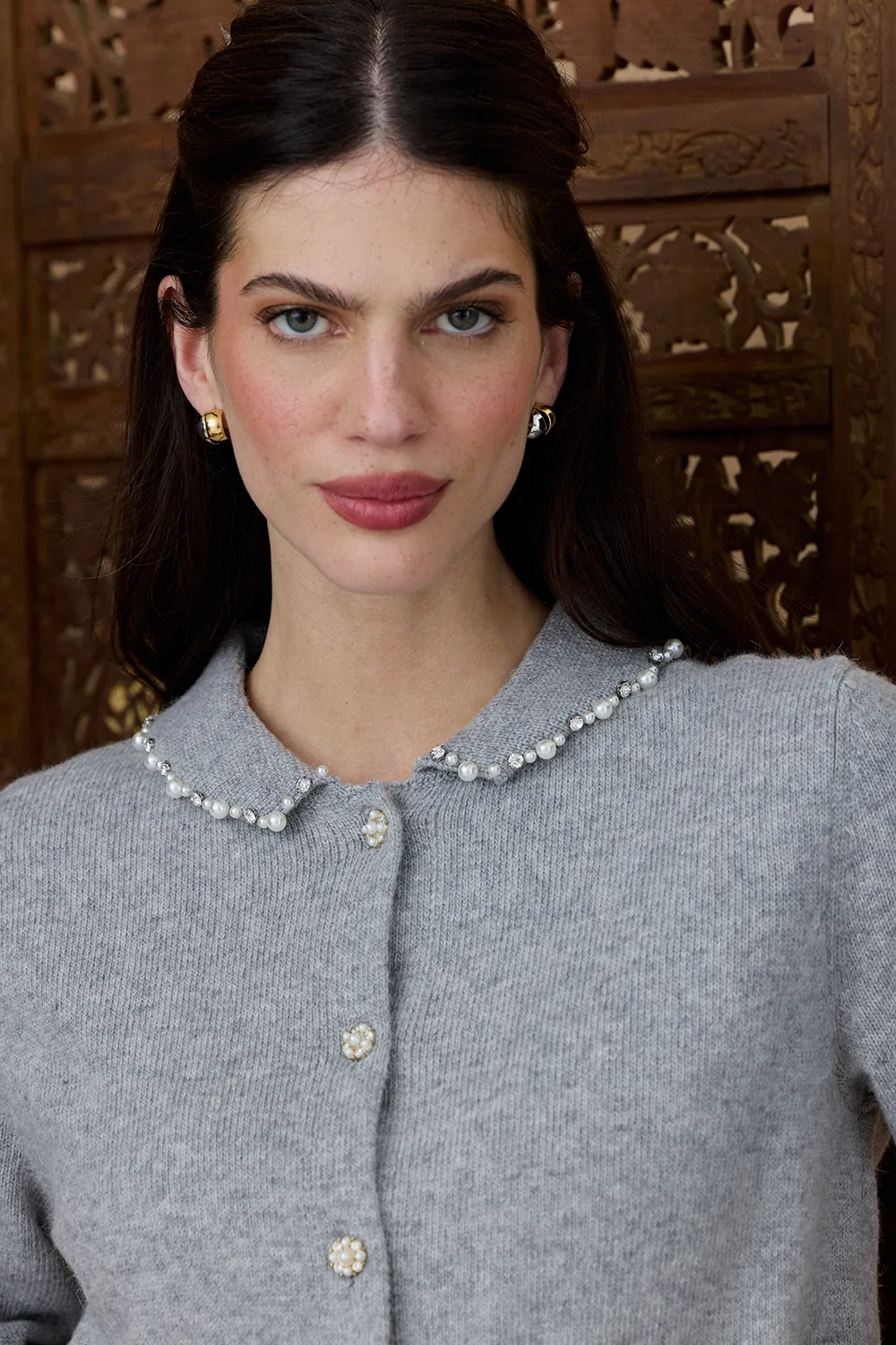 El Saco Punarvana presenta un diseño tejido con delicados detalles de perlas en su cuello