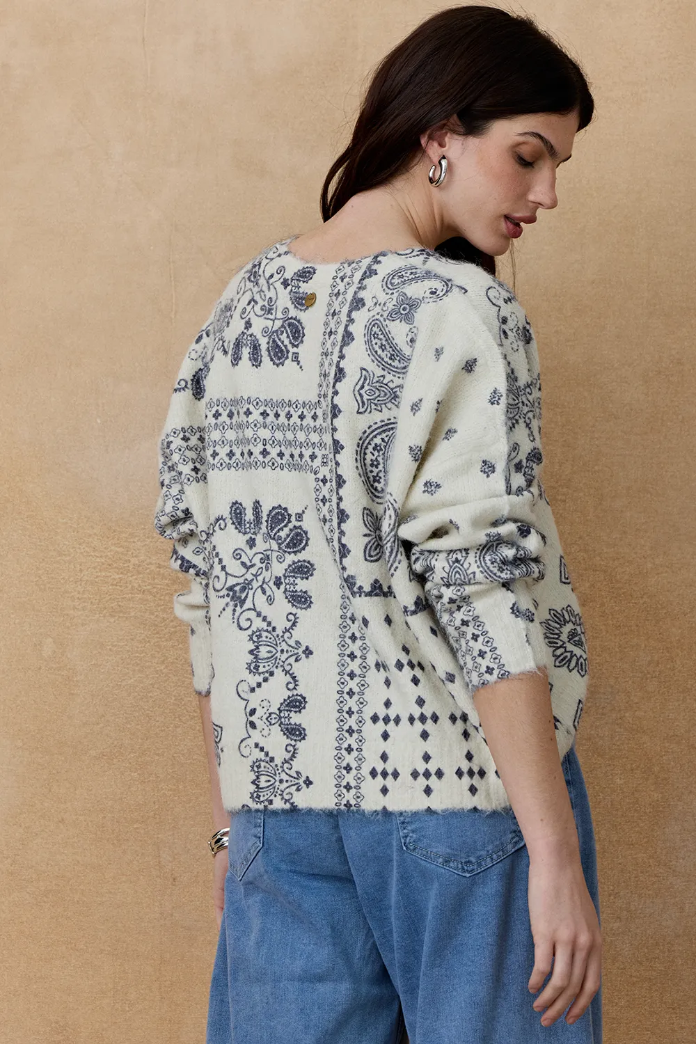 El Saco Rivka presenta un diseño con escote en V y estampa de bandana