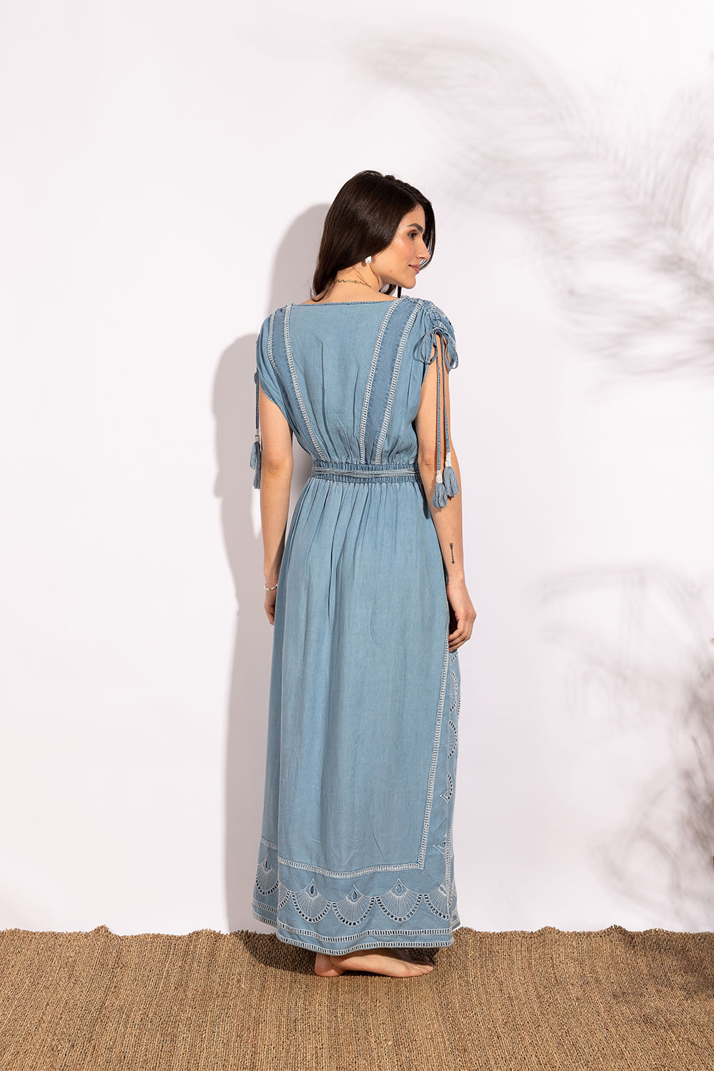 Kaftán largo bordado sin mangas. Se ajusta a la cintura por medio de un elástico y lazo en la parte delantera. La falda tiene dos aberturas delanteras que dejan ver las piernas al caminar. Confeccionado con tejido simil denim 100 % rayón.