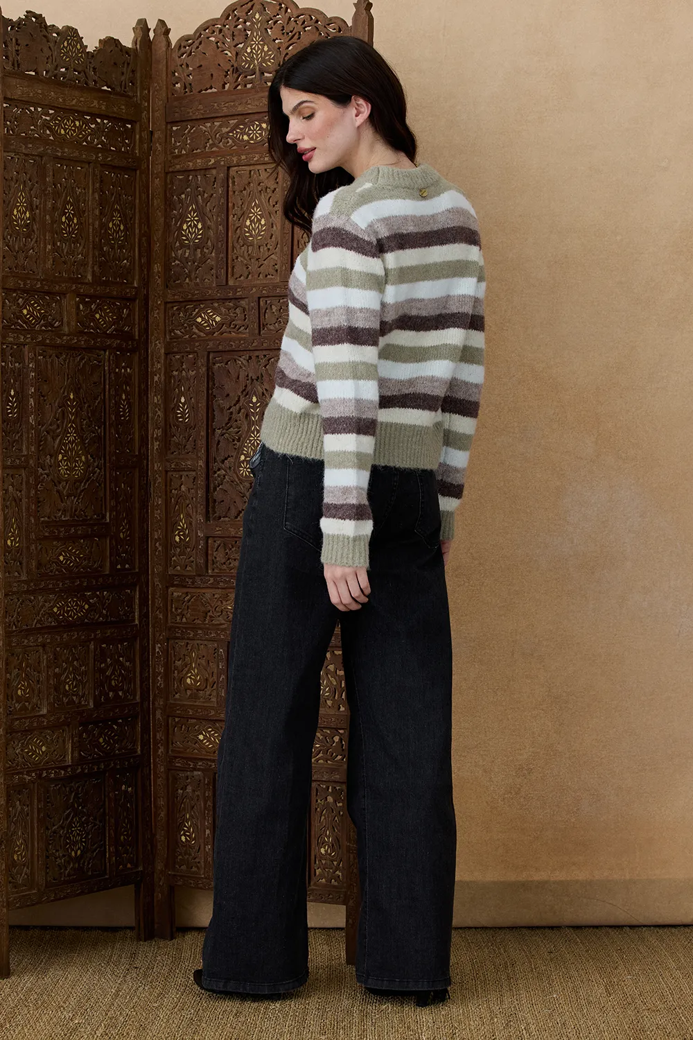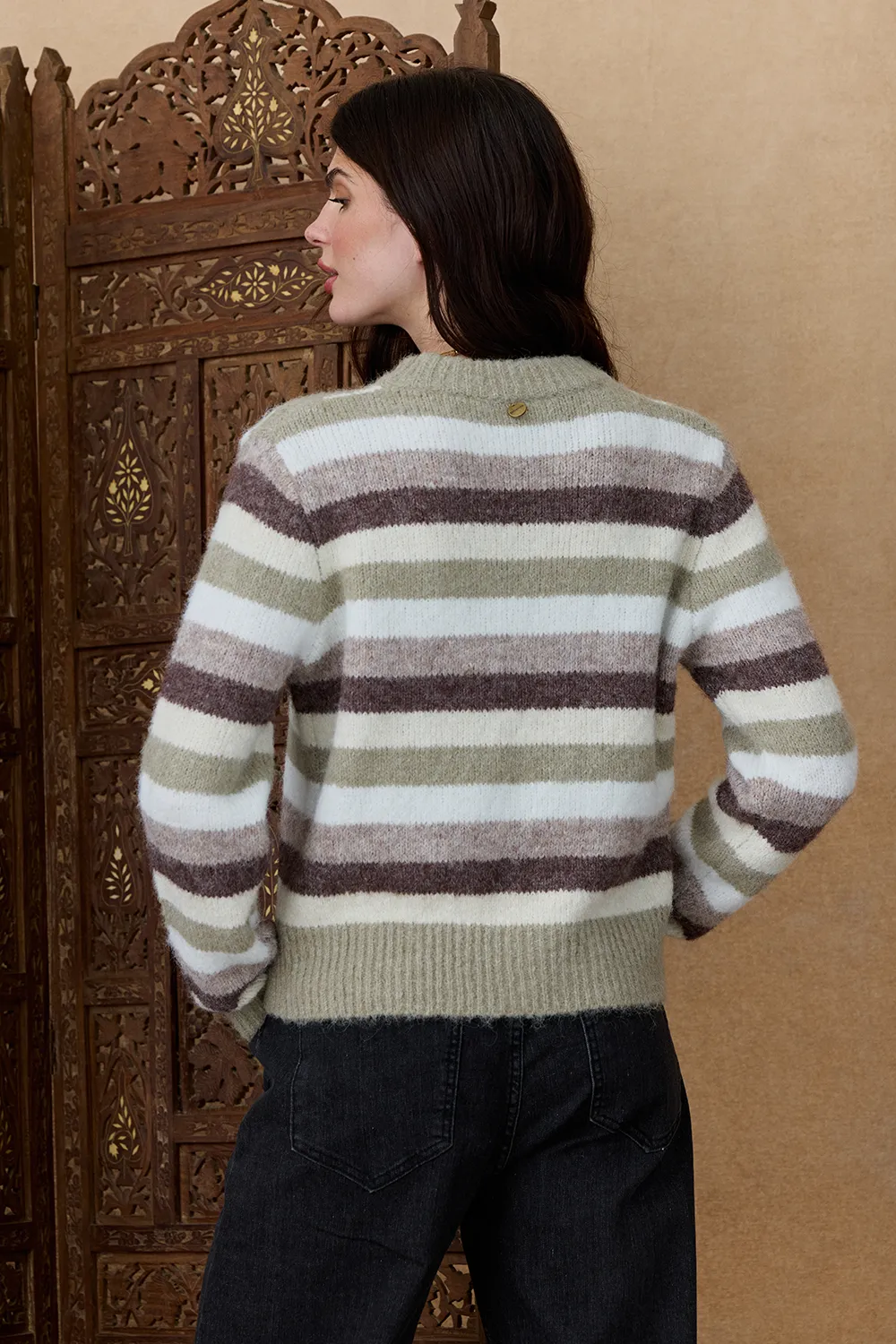 El Sweater Arjuna es un sweater tejido a rayas con escote redondo.