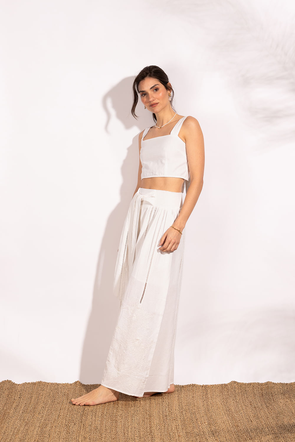 Top corto con espalda descubierta. Luce un gran festón bordado que crea un bonito lazo. Combina a la perfección con nuestra falda Ibera. Su composición es lino de algodón 100%, lo que le da un toque fresco y elegante.