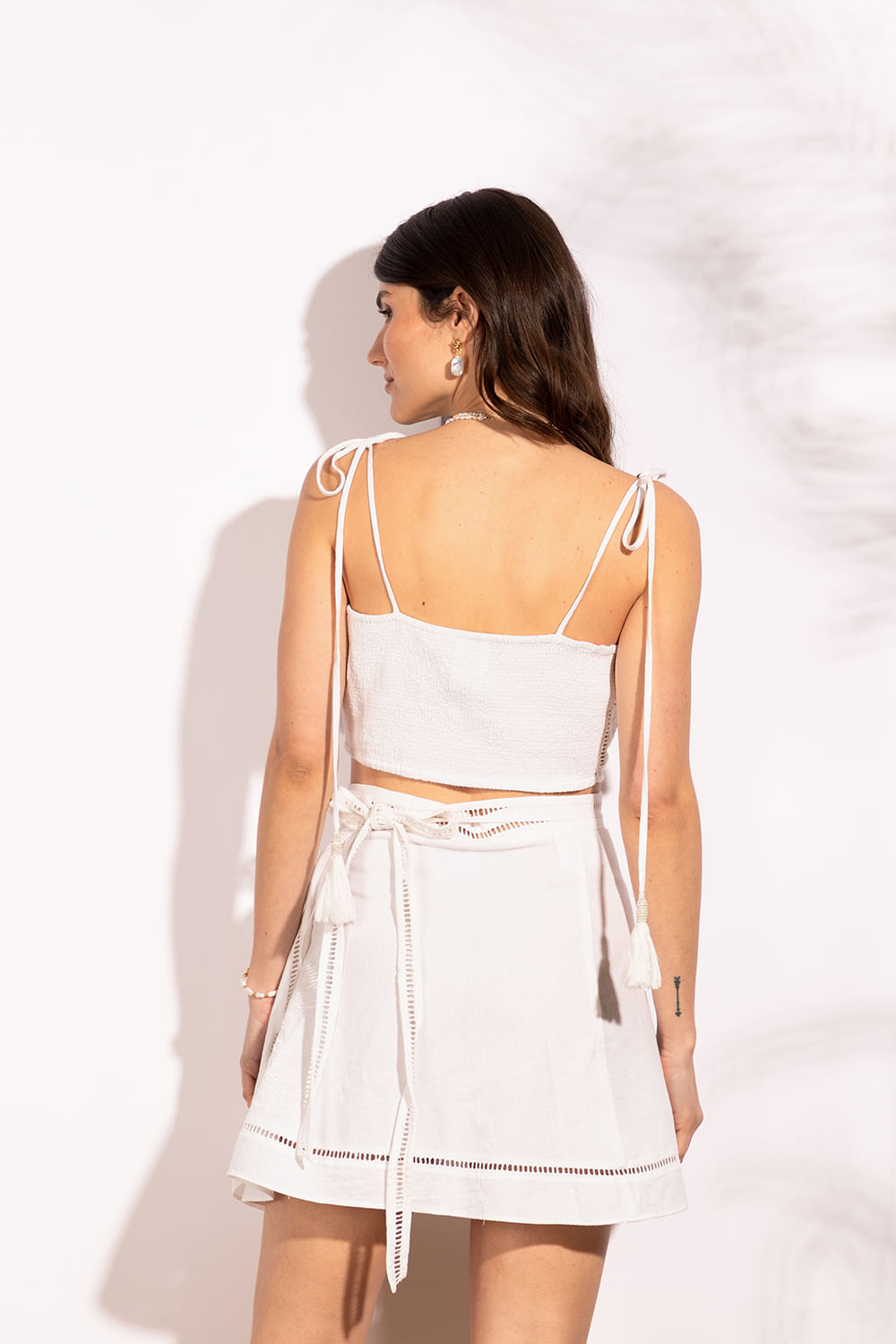 Top con exclusivo diseño de bordado, que cubre hasta el abdomen. Adornado con festones calados en el escote. Sus lazos regulables se ajustan a los hombros y el smock elastizado en su espalda hace que se adapte perfectamente a tu cuerpo. Confeccionado con lino de algodón 100 %. Lo podés combionar con nuestro PANTALÓN RÍO.