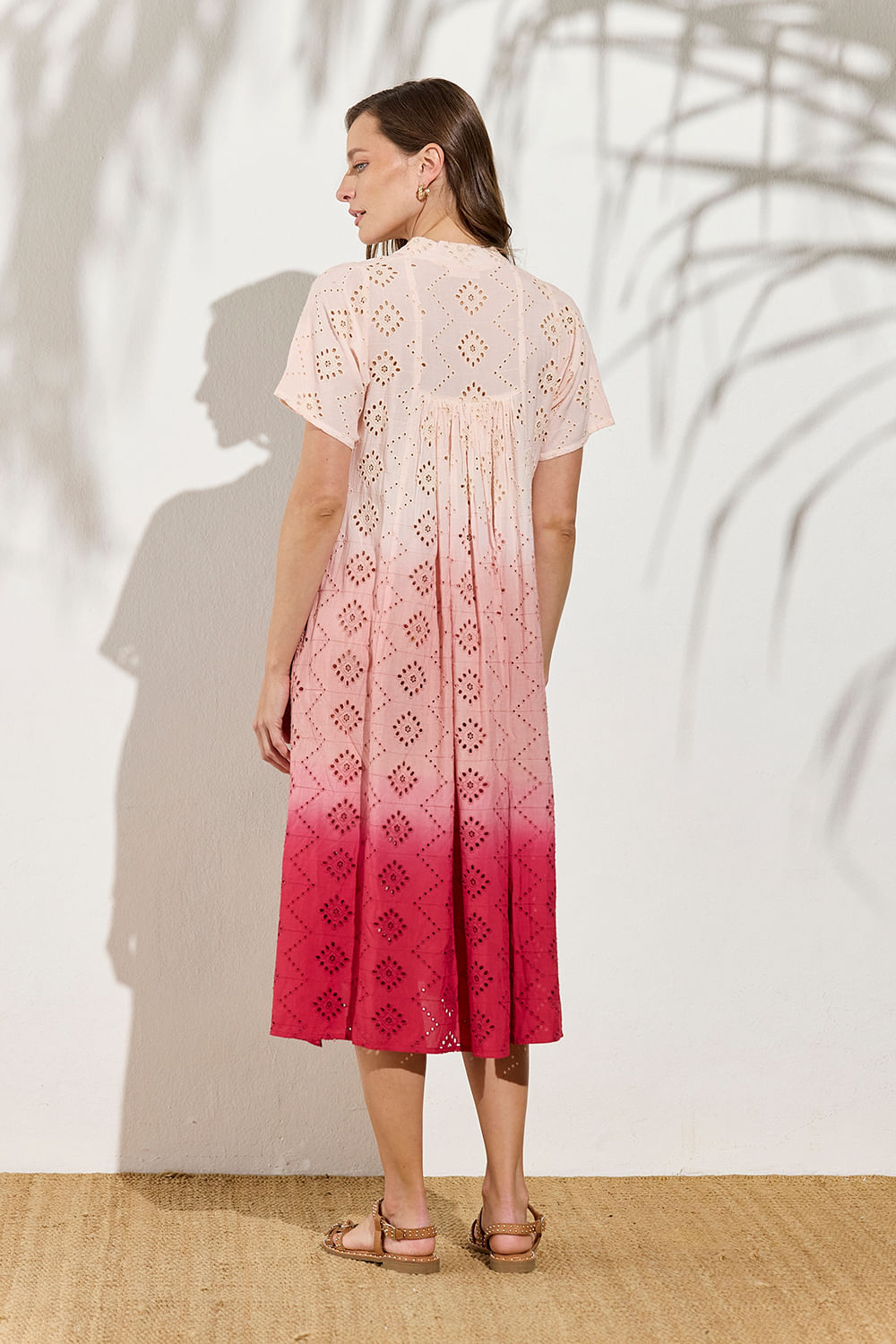 Túnica larga de manga corta confeccionado en un broderie teñido en degrade. Pose escote en v y un corte holgado gracias los frunces en su escote. Se puede combinar con la CARTERA KALU.