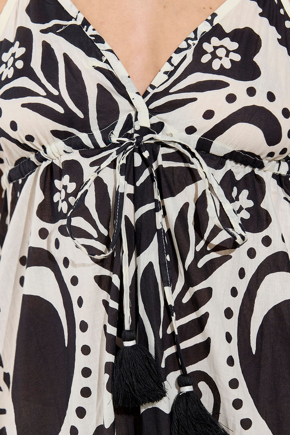 Vestido largo de escote en V, con regulación de breteles y ajuste de bajo del pecho. De corte holgado y terminación en delicados volados en su parte inferior y espalda. Lo podés combinar con las SANDALIAS TIRU.