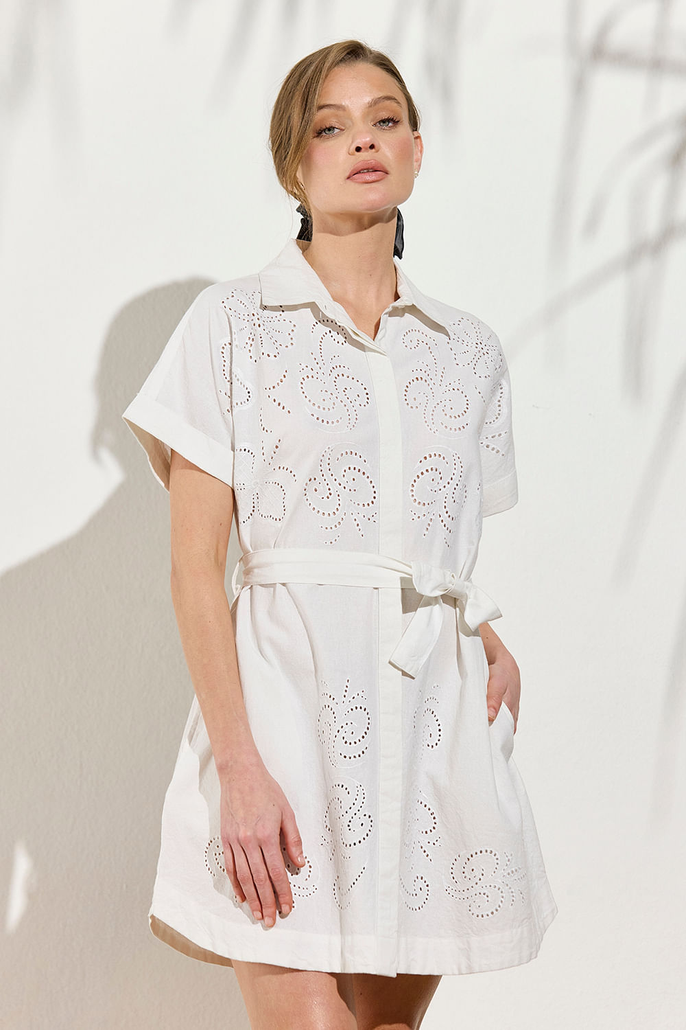 Vestido estilo camisero, de largo por encima de la rodilla, confeccionado en algodón de manga corta. Bordado y calado delicadamente en la parte frontal. Con cinto para ceñir la cintura.