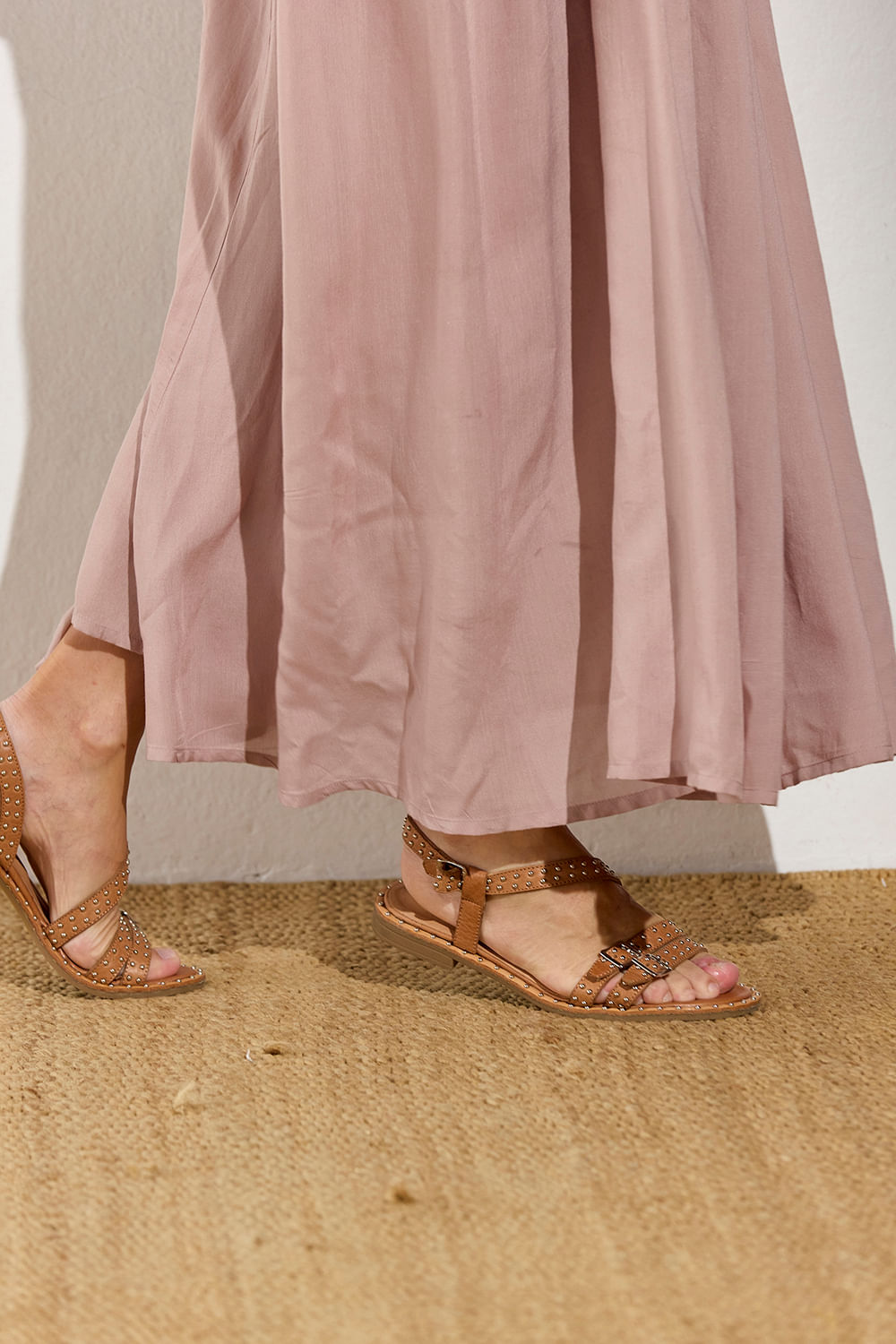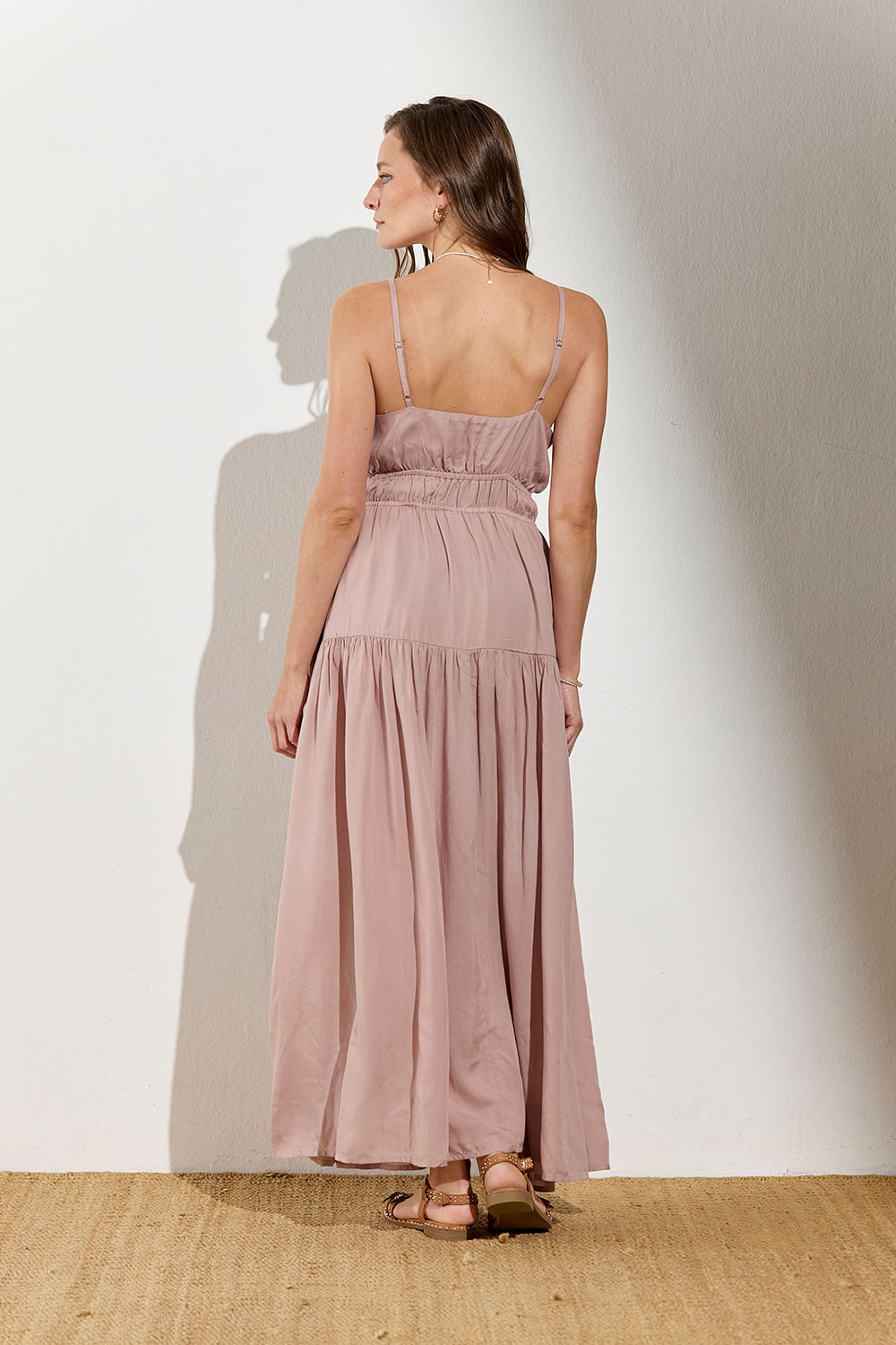 Vestido largo, de corte holgado, sin mangas y ajuste en cintura por medio de elástico. De escote en V y terminación con un delicado volado en su parte inferior lo que le da mayor ligereza y movimiento. Posee unos lazos en la parte delante a modo decorativo. Lo podes combinar con las SANDALIAS TIRU.